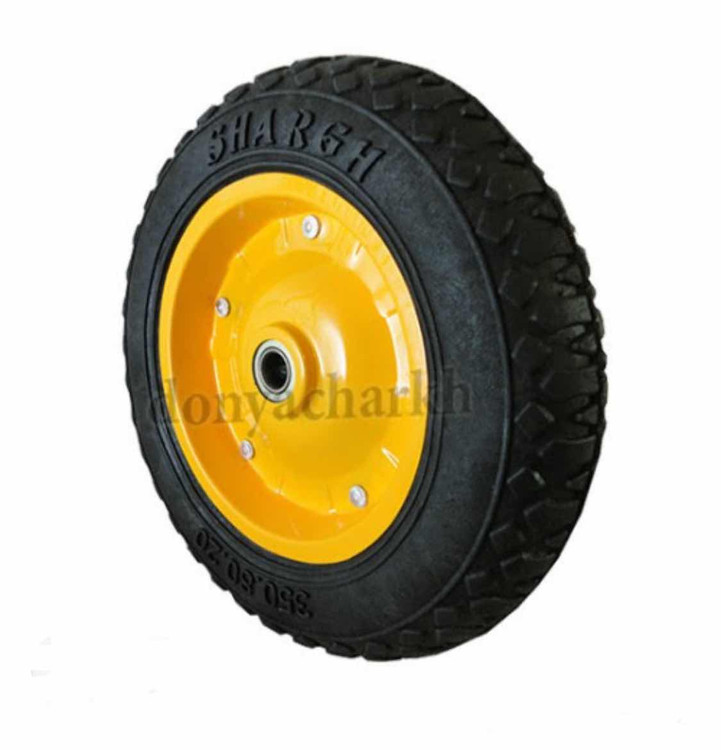 چرخ فرقون تیوپلس pvc بلبرینگی (استفاده در فرغونهای ساختمانی برای جابجایی مصالح در زمینهای ناهموار-حرکت نرم و ضربهگیر روی خاک، شن، ماسه و آسفالت-مناسب برای کارگاههای عمرانی، کشاورزی و باغبانی-کاهش فشار روی دست و بدن کاربر هنگام حمل بار سنگین-قابلیت جذب ضربه و جلوگیری از آسیب به بار در مسیرهای خشن-تحمل وزن بالا همراه با انعطافپذیری مناسب-نصب آسان روی انواع فرغونهای سبک و سنگین-افزایش طول عمر فرغون در محیطهای کاری سخت و متغیر)